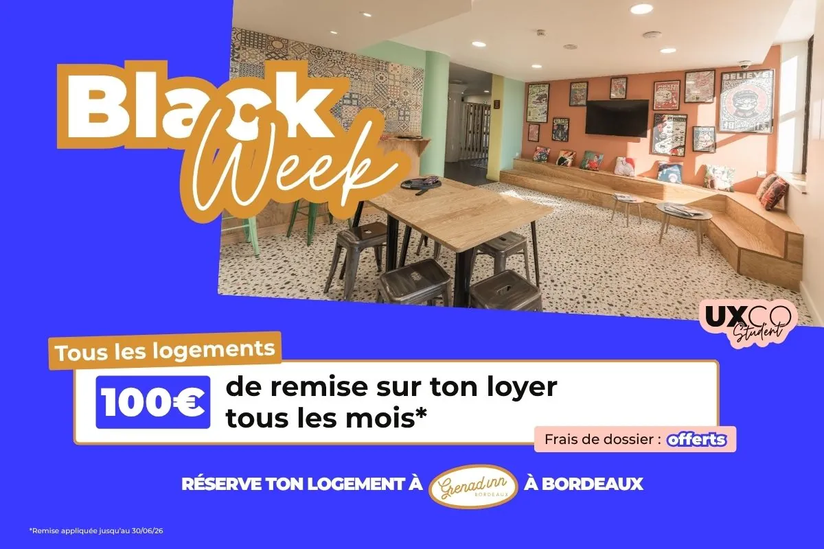 Profite de la Black Week pour réserver ton logement : -50% sur les frais de dossier et 100€ de remise sur ton loyer jusqu’au 30 juin 2026 ! Offre valable jusqu’au 2 décembre, dépêche-toi ! ⏳